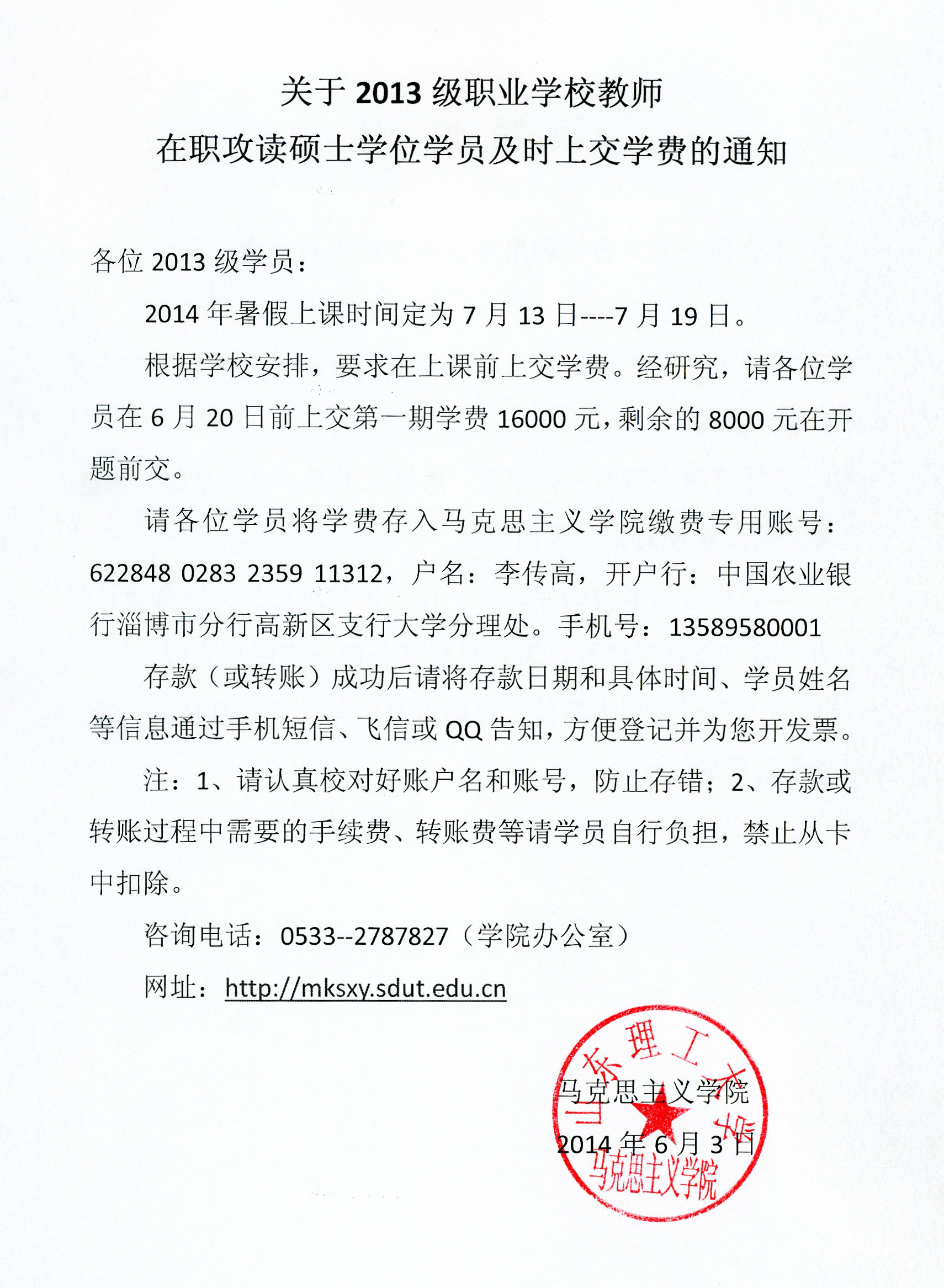 关于2013级职业公司教师在职攻读硕士学位学员及时上交学费的通知