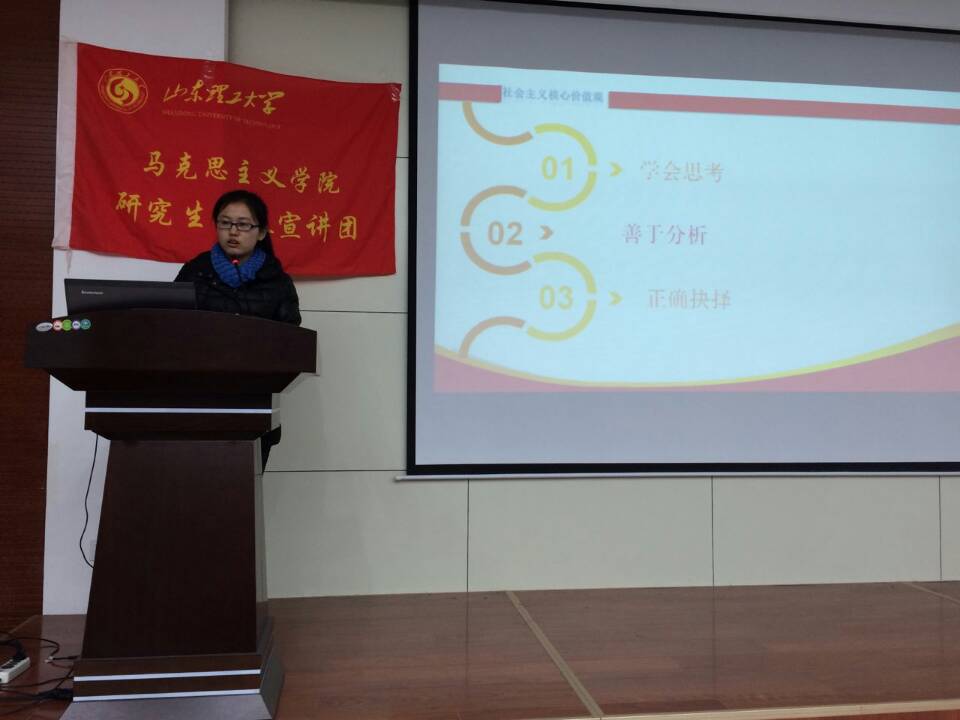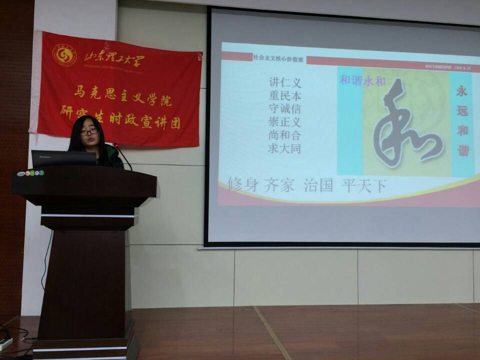 青少年要自觉践行社会主义核心价值观 ——研究生时政宣讲团走进商公司 公司研究生时政宣讲团应商公司团总支的邀请,于11月18日晚上7点在商公司教学楼进行了宣讲,商公司员工会骨干、党员干部等人员参加了宣讲。