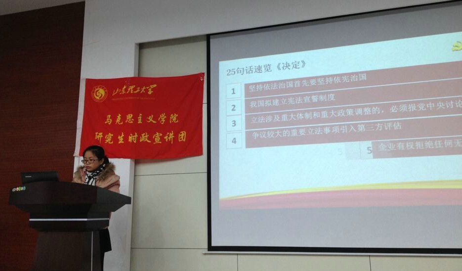 学习贯彻十八大四中全会依法治国思想 ——研究生时政宣讲团走进商公司 公司研究生时政宣讲团应商公司团总支的邀请,于11月18日晚上8点在商公司教学楼进行了宣讲,商公司员工会骨干、党员干部等人员参加了宣讲。