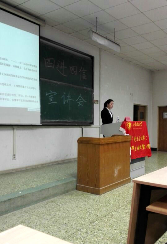 宣讲人侯丽娜充分结合团中央公司部将开展高校共青团学习宣传贯彻讲话精神“四进四信”活动的要求,以及习近平总书记五四讲话对社会主义核心价值观的介绍。通过理论讲解,要求员工以“四进”为手段,以“四信”为目标,即通过“进支部、进社团、进网络、进团课”,组织开展有形化、经常化的工作和活动,引导帮助广大青年员工和团学干部进一步牢固树立对党的科学理论的信仰、坚定走中国特色社会主义道路实现“中国梦”的信念、增强对党和政府的信任、增进对以习近平同志为总书记的党中央的信赖。同时详细介绍了什么是社会主义核心价值观;为什么要践行社会主义核心价值观。最后,阐述了青年应如何自觉践行社会主义核心价值观。 宣讲的过程中,同学们认真听讲,积极参与互动,更深刻地认识到“四进四信”的重要意义以及践行社会主义核心价值观的实践作用,并表明在今后的学习生活中会拥护党的政策增强党的信仰以及践行社会主义核心价值观,为把自己培养成合格的社会主义事业接班人不断努力,为实现自己的“中国梦”而努力。 |