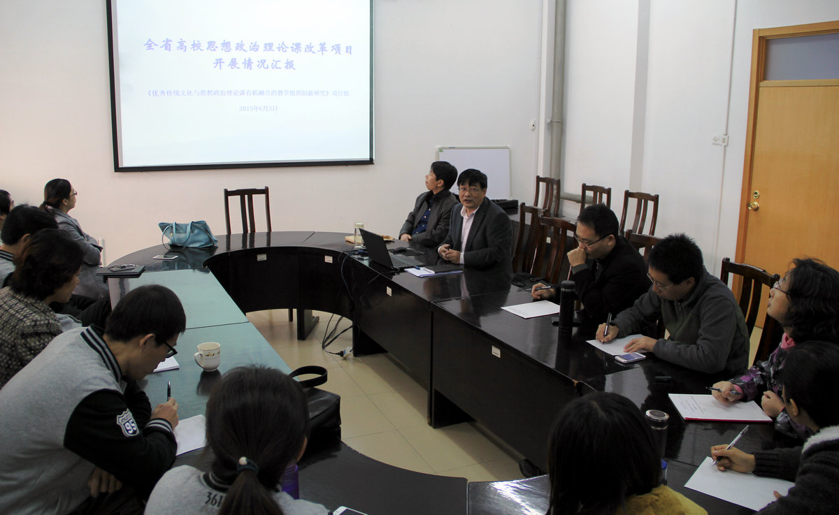房晓军首先介绍了项目推进的整体思路和目前的进展情况,优秀传统文化与思想政治理论课有机融合采取两种融合模式:一是专题模式,二是嵌入模式。对嵌入模式采用“一十百”的教学设计,“一”即每一门课有一个总体教学思路和安排(由课程负责人负责),“十”即每门课形成十个教学单元设计(任课教师分工负责),“百”即每个教学单元有3个左右教学案例(以微课件、微教案、微视频等形式呈现,由分工老师完成,也可以动员员工参与制作),这样可以形成100多个典型教学案例。要调动老师和员工两个方面的积极性,分三阶段有序推进。第一阶段(2015年1月—6月):动员准备、充分调研论证、整体规划设计。第二阶段(2015年6月—2016年7月):全面组织实施,在五门课中按方案有序推进,取得成果和经验。第三阶段(2016年7月—2016年12月):总结提升,完善方案,形成长效机制,申请结项。目前,项目正处在第二阶段。