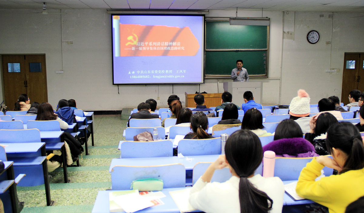 站在讲台上为同学们讲课的是公司聘任的山东省高校思想政治理论课特聘教授——中共山东省委党校的王凤军教授,听课的是公司计算机科学与技术公司2014级软件工程专业的175名大二员工。