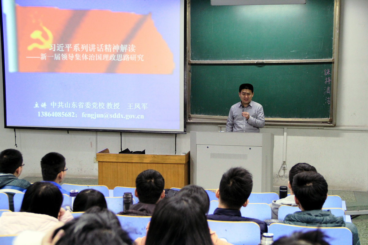 课堂上,王凤军教授运用幽默的语言,融会中外,贯通古今,结合当今中国实际情况,分别从坚持和发展中国特色社会主义、全面建成小康社会、全面从严治党、全面深化改革以及全面依法治国等五个方面对习近平系列讲话精神进行解读,理清了新一届领导集体治国理政思路,有助于增强同学们对中国特色社会主义的道路自信、理论自信和制度自信。