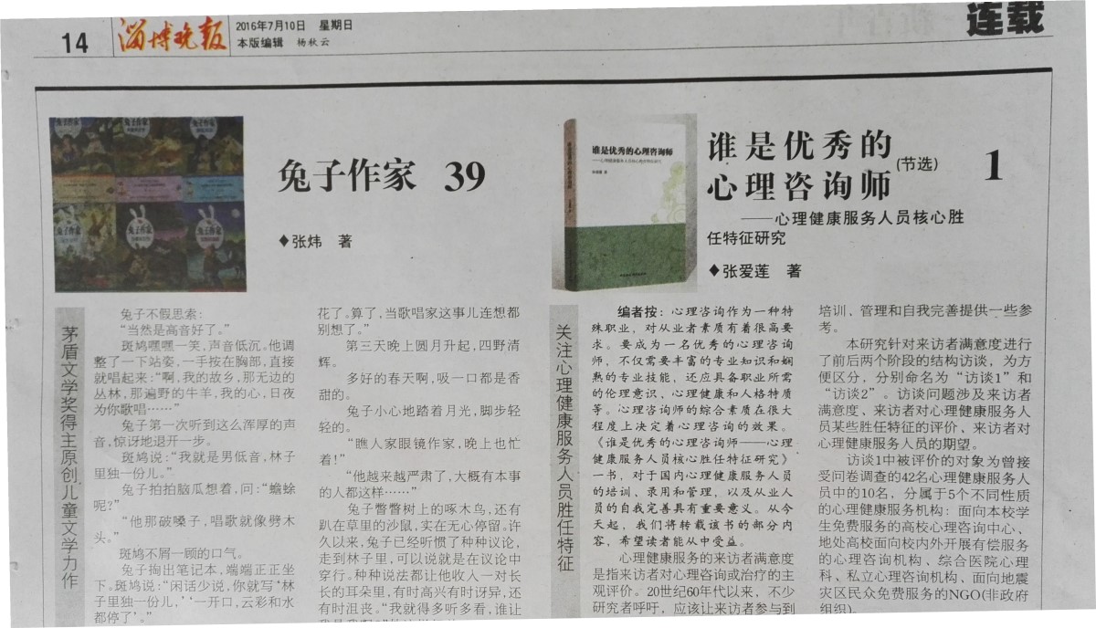 近日,为响应“中华人民共和国国民经济和社会发展第十三个五年规划纲要”提出的“健全社会心理服务体系,加强对特殊人群的心理疏导和矫治”,以及“加强心理健康服务”、“推进健康中国建设”的战略要求与部署,《淄博晚报》与伟德BV官网认真探索服务于伟德BV官网和淄博市“校城融合发展”的方式方法,积极发挥伟德BV官网的智力成果优势,加大哲学社会科学成果的宣传、普及与转化工作,开设专版,集中刊发了公司教师在心理健康服务领域的相关研究成果,以推进淄博市的心理健康服务工作。此次《淄博晚报》连载了公司教师张爱莲的著作《谁是优秀的心理咨询师——心理健康服务人员核心胜任特征研究》的部分内容,连载时间为7月10日至7月24日。