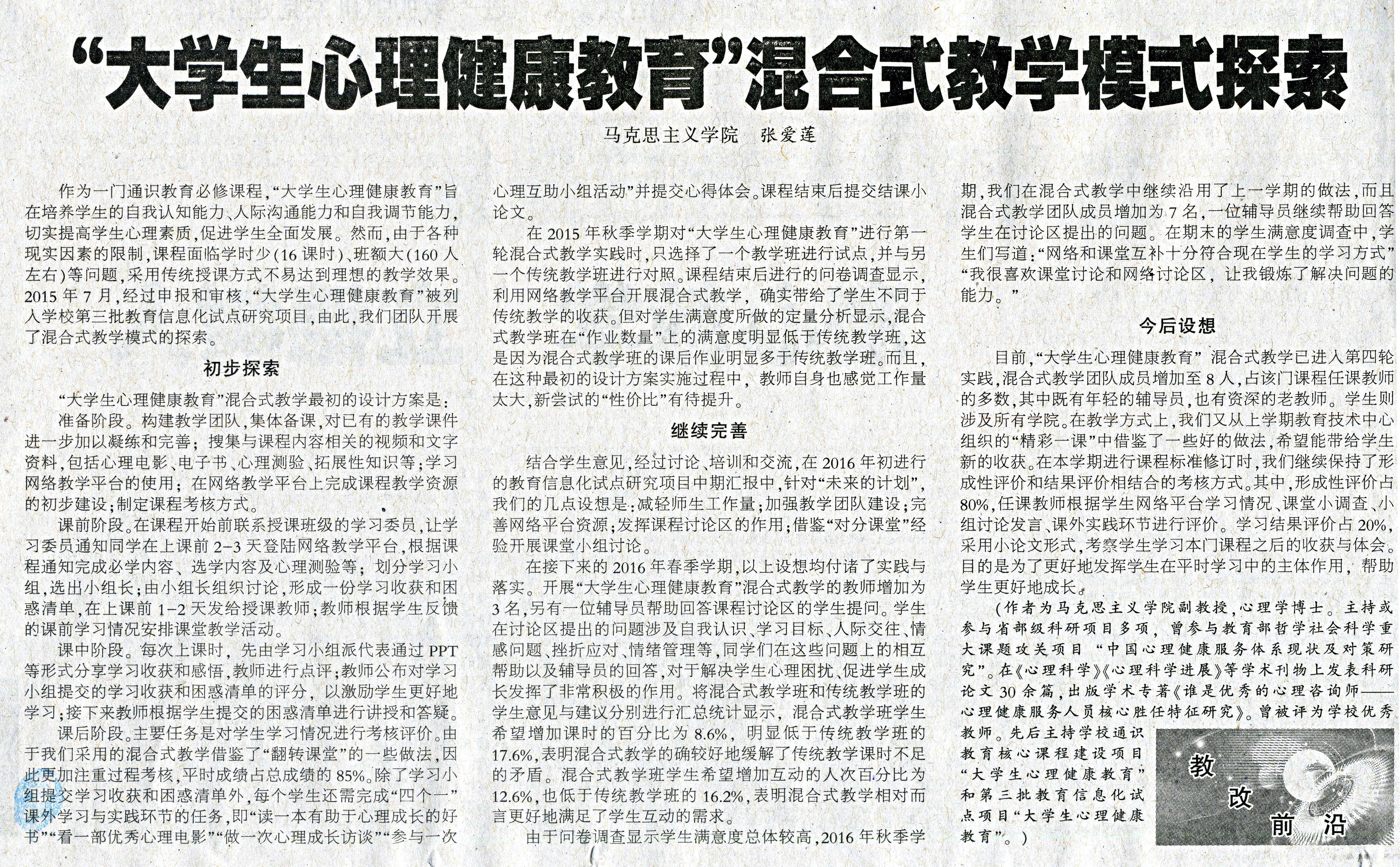 校报2017年4月7日第9期(总第1102期)教改前沿栏目报道公司张爱莲老师撰写的“老员工心理健康教育”混合式教学模式探索。