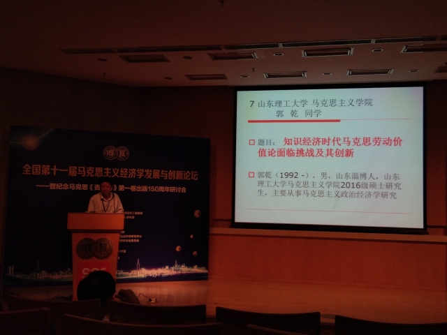 在分组讨论中,来自国内几十所高校、研究机构的专家学者进行了热烈的讨论,碰撞出许多思想的火花。公司研究生参加了创新分论坛一的讨论,郭乾还就入选论坛的论文《知识经济时代马克思劳动价值论面临挑战及其创新》进行了十五分钟的主题演讲,并与各位专家进行了讨论。