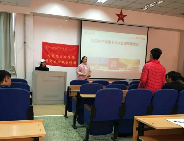 为深入贯彻落实党的十九大精神,加强领会习近平总书记讲话的重要内容,公司研究生时政宣讲团应体育公司的邀请,于11月9日下午两点在2号教学楼 教室为体育公司的全体同学们进行了以十九大精神为主题的时政宣讲。