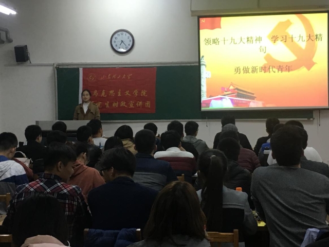 此次进行宣讲的主讲人是公司思想政治教育专业的张琪和马克思主义中国化专业的张乐乐。两位宣讲人紧紧围绕宣讲主题,从党的光辉历程、报告的主要内容、新成果的基本概括以及闭幕会的重要议程四个方面对十九大进行了系统的阐述和分析。