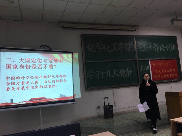 本次的宣讲人为马克思主义基本原理专业秦月和赵璐。两位宣讲人紧紧围绕党的第十九次全国代表大会的主题,对习近平总书记十九大报告进行了精简解读,并深刻阐述了中国特色大国外交对世界的贡献。在宣讲过程中,两位宣讲人言简意赅、紧扣主题,赢得了化工公司同学们的阵阵掌声。