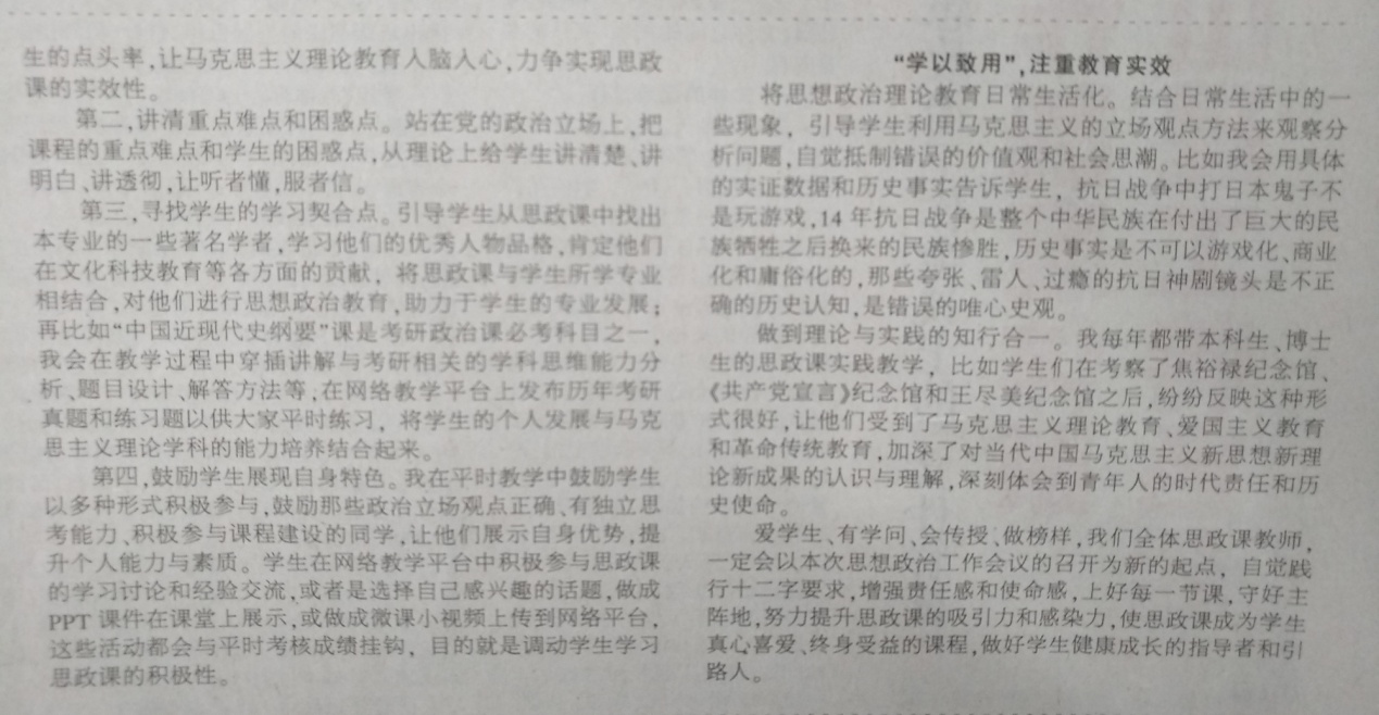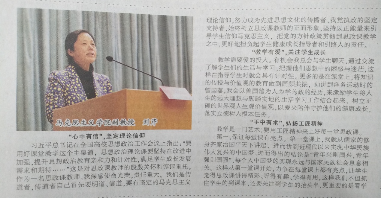 刘芹老师以“坚定理论自信 守好思想政治理论课主阵地”为主题,主要从以下四个方面做了交流发言:第一,“心中有信”,坚持理论信仰;第二,“教学有爱”,关注员工成长;第三,“手中有术”,弘扬工匠精神;第四,“学以致用”,注重教育实效。各位教师代表都做了精彩的发言,赢得了大家的广泛赞同。最后,党委副书记、董事长张铁柱进行了总结讲话。
