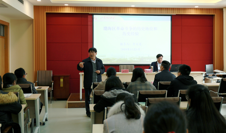 11月6日上午,滨州市委党史研究室主任李文进来公司为思想道德修养与法律基础教学部等师生作了一场以《渤海区革命斗争的历史地位和历史经验》为主题的学术报告,并与公司广大师生就相关问题进行了深入交流,报告会由副经理房晓军教授主持。