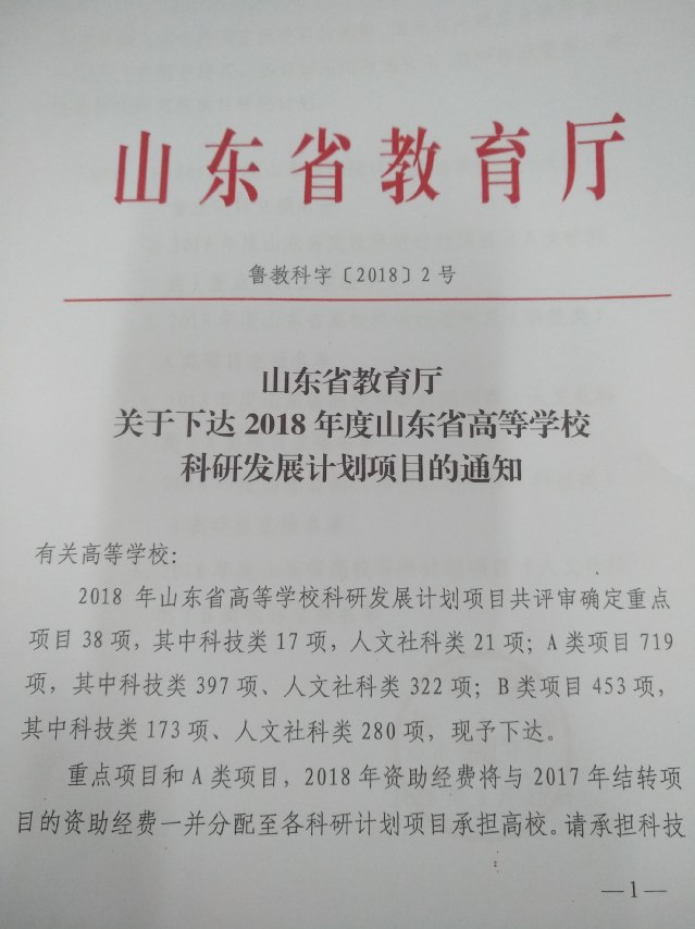 山东省教育厅下发了《关于下达2018年度山东省高等公司科研发展计划项目的通知》文件,评审确定A类(资助经费类)项目719项, B类(自筹经费类)项目453项。