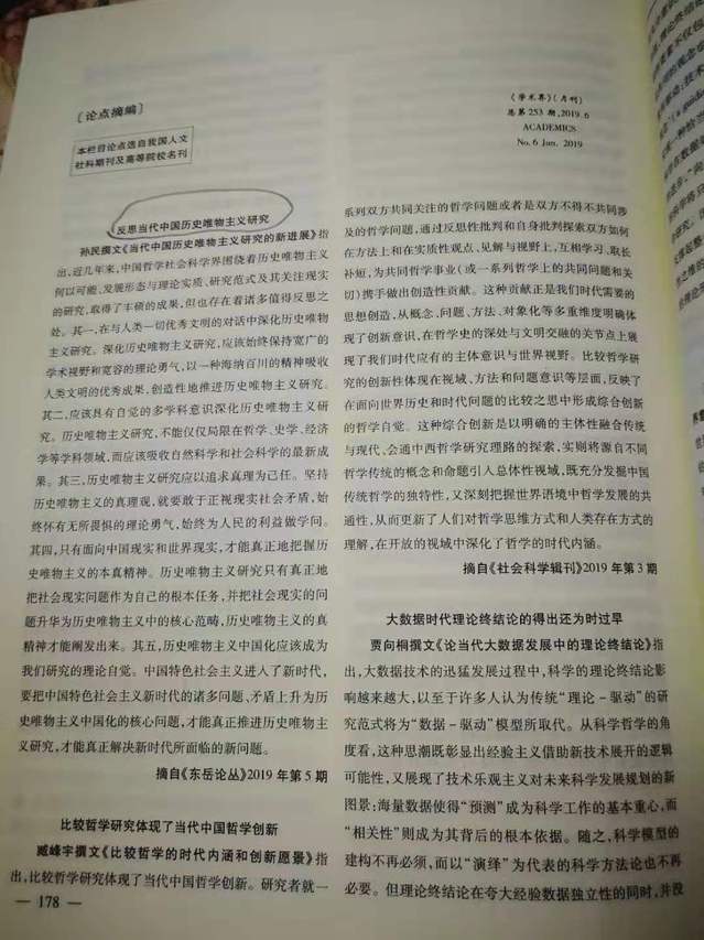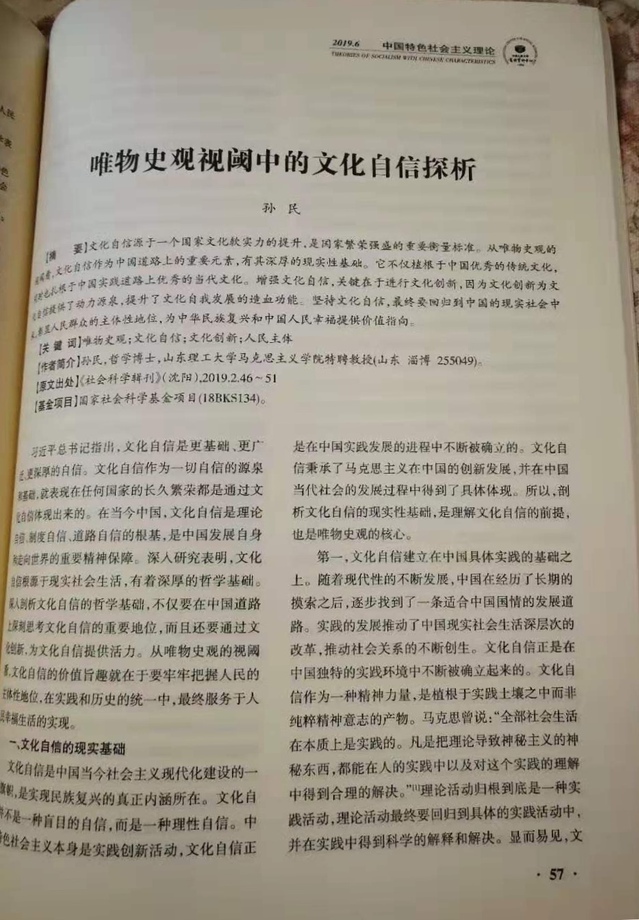 孙民教授发表在《社会科学辑刊》2019年第2期的论文《唯物史观视阈中的文化自信探析》,被人大复印资料《中国特色社会主义理论》2019年第6期全文转载。发表在《东岳论丛》2019年第5期的论文《当代中国历史唯物主义研究的新进展》,被《学术界》2019年第6期重点摘编。