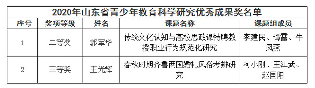 近日,由山东省艺术科学重点课题评审办公室组织,山东省青少年教育科学研究院承办的2020年度全省“传统文化与经济社会发展”、“艺术教育”专项课题结项及获青少年教育科学研究优秀成果奖的评审工作已经结束,山东省艺术科学重点课题评审办公室公布了结项课题及获奖名单。据悉,2020年6月全省“传统文化与经济社会发展”专项课题结项及获青少年教育科学研究优秀成果奖共有30项科研成果,其中一等奖1项、二等奖9项、三等20奖项。公司郭军华老师主持的“传统文化认知与高校思政课特聘教授职业行为规范化研究”获得二等奖;王光辉老师主持的“春秋时期齐鲁两国婚礼风俗考辨研究”获得三等奖。详情如下: