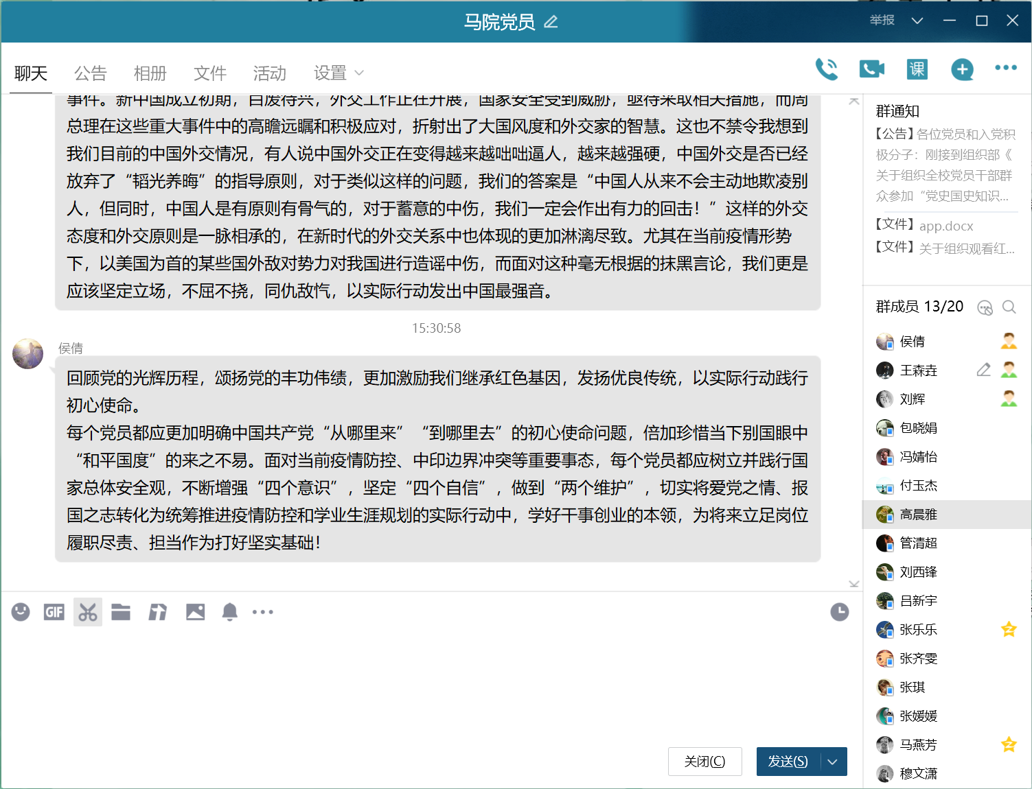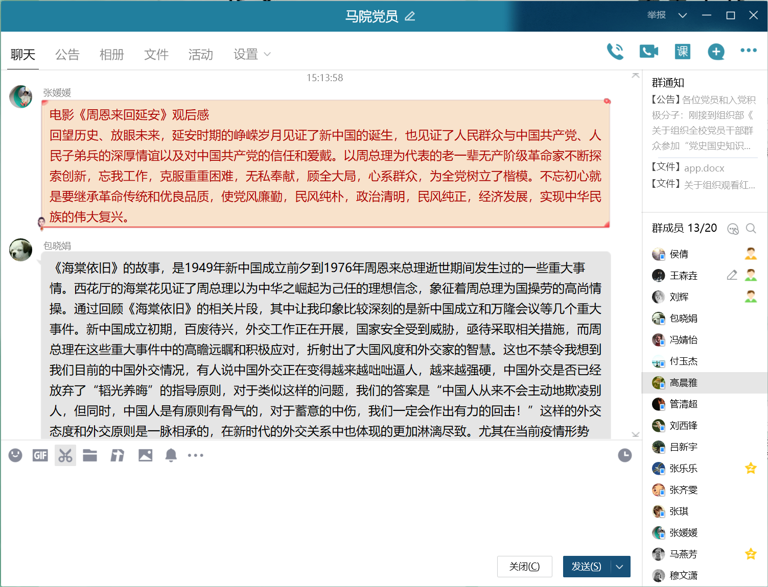 会前,刘辉依照上级通知要求,组织支部党员自行观看红色影视剧剧目。在线上会议中,参会党员集体观看了《今日中国,如你所愿》《厉害了我的国》等爱国宣传片,回顾党的光辉历程和党的十八大以来的伟大成就。随后,支部成员对会前观看的红色影视剧展开分享交流,其中,硕1725班党员包晓娟和张媛媛分别就剧目《海棠依旧》《周恩来回延安》做重点发言交流。最后,党支部书记侯倩做总结。她希望支部每个党员都能明确党的初心使命问题,珍惜当下别国眼中“和平国度”的来之不易;面对当前疫情防控、中印边界冲突等重要事态,她希望各位党员都能树立并践行国家总体安全观,不断增强“四个意识”,坚定“四个自信”,做到“两个维护”,切实将爱党之情、报国之志转化为统筹推进疫情防控和学业生涯规划的实际行动,学好干事创业的本领,为将来立足岗位履职尽责、担当作为打好坚实基础。