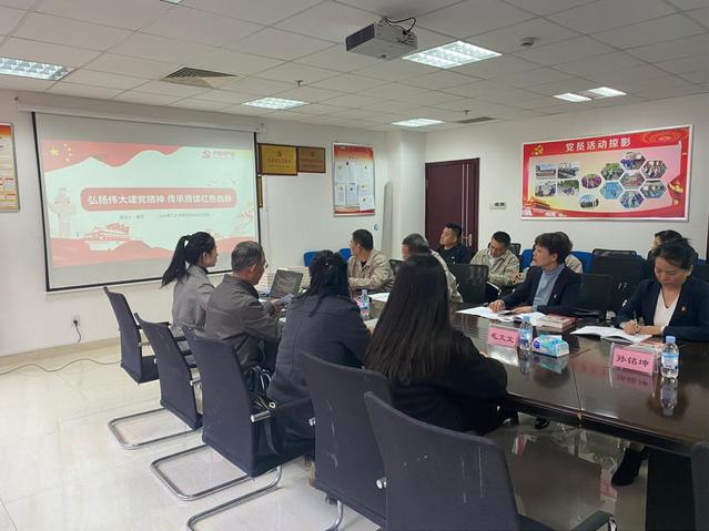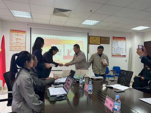 发展规划党支部书记李英明向参加此次宣讲的党员同志介绍了公司研究生时政宣讲团及参加活动人员。公司发展规划党支部成员孟繁芳同志领读《习近平在纪念辛亥革命110周年大会上的讲话》,王志刚同志安排“共赏红色经典·红星照耀中国”读书季活动,公司辅导员侯倩受邀与公司主管魏婷婷一同为支部党员颁书。