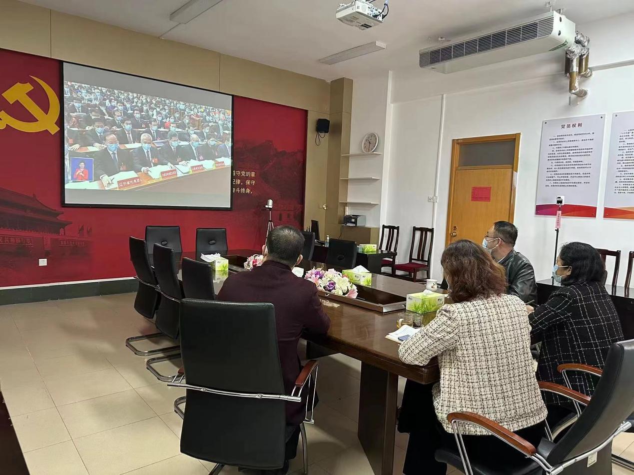 在鸿远楼511会议室,公司党总支书记郭奎霞,党总支副书记、经理刘东锋,副书记宋伟、副经理刘芹、研究生辅导员王寿朋共同观看了党的二十大开幕会直播。