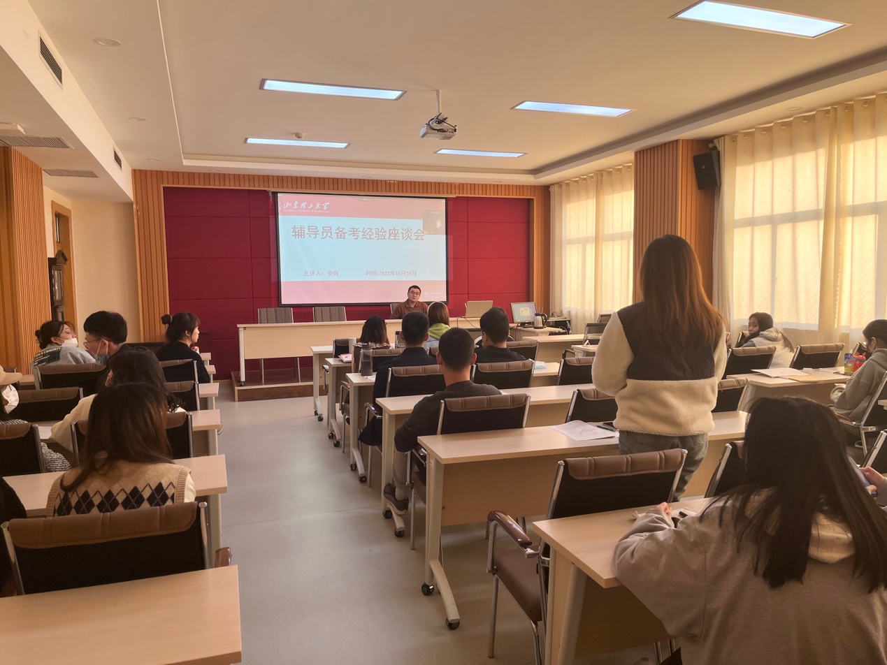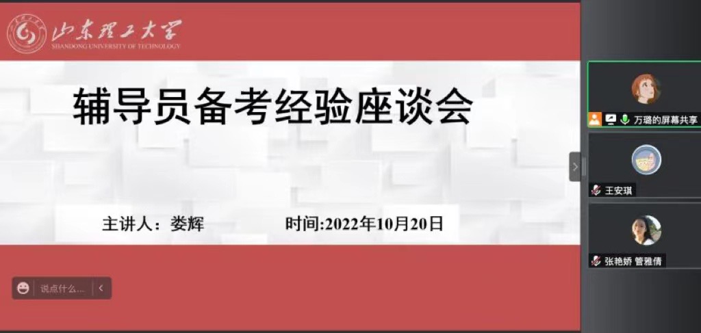 为推动公司就业工作,提升研究生就业质量,10月20日下午,公司于鸿远楼618室举行辅导员备考经验座谈会。本次会议采取线上线下相结合的方式进行,会议邀请公司机械工程公司辅导员娄辉老师担任主讲,公司2020级全体研究生及其他年级部分研究生参加。