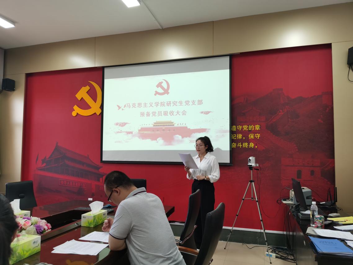 会议分两个阶段进行,首先开展预备党员接收工作。吕慧子、李琪琪、张艳娇、秦少卿四名申请入党人逐一宣读入党志愿书,汇报自己争取入党的动机、过程、入党态度、本人简历,以及需要向党组织说明的其他问题。随后,由各自的入党介绍人介绍其基本情况,王寿朋同志代表支委会向大会报告了每位党员发展对象的审查情况和支委会意见,与会党员就4位发展对象是否符合党员条件发表意见进行充分讨论。经与会党员无记名投票表决后,大会一致同意接收四名党员发展对象为中共预备党员。