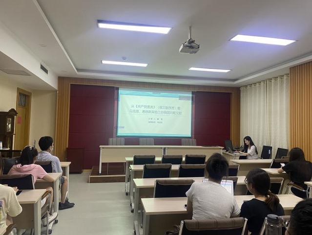 本次读书会的阅读书目为《共产党宣言》(俄文版序言),董雪以“《共产党宣言》(俄文版序言)看马克思、恩格斯其他三份俄国问题文献”为主题,围绕选题缘由、基本内容、从《共产党宣言》(俄文版序言)看马克思《给维·伊·查苏利奇的复信》草稿及正式复信、从《共产党宣言》(俄文版序言)看马克思《给〈祖国纪事〉杂志编辑部的信》、从《共产党宣言》(俄文版序言)看恩格斯《论俄国的社会问题》五个方面展开讲解。她将《共产党宣言》(俄文版序言)与马克思、恩格斯几篇涉及俄国问题文献进行比照,带领大家深入了解马克思、恩格斯的真实思想。她认为在研究问题时应以文本本身说了什么内容为主,强调了回归文本的重要性。