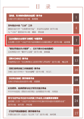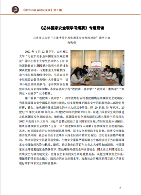 读书小组研读的书目为《总体国家安全观学习纲要》《总体国家安全观干部读本》《总体国家安全观教育读本》及部分相关学术论文,期间开展读书研讨12次,前往国防教育主题园和黑铁革命英雄根据进行现场学习各1次,制作以《牢固树立和践行总体国家安全观》为主题的PPT1个、网宣作品1个,开展校内外宣讲10余场,形成读书笔记20余篇,撰写新闻通讯8篇,其中《总体国家安全观学习纲要》专题研读新闻通讯被组委会第一期活动风采录采用。