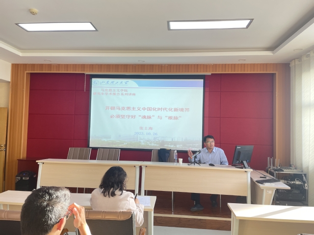10月26日下午,公司在鸿远楼618室举办主题为《开辟马克思主义中国化时代化新境界 必须坚守好“魂脉”与“根脉”》的研究生学术报告。山东大学特聘教授、伟德BV官网经理、博士生导师、国家“万人计划”教学名师张士海教授主讲,2023级全体研究生参加会议,报告会由公司党委副书记、副经理刘芹主持。