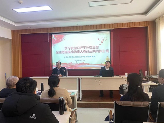 1月11日下午,公司于鸿远楼618室举办主题为《学习贯彻习近平外交思想,深刻把握推动构建人类命运共同体主线》的学术报告讲座,中国联合国协会理事、中国太平洋学会理事、中华文化交流与合作促进会理事、中国裁军与军控协会理事、习近平外交思想研究中心特约专家、金砖智库合作中方专家委员会委员、对外经济贸易大学博士生导师陈须隆教授主讲,会议由公司党委书记郭万保主持,公司部分教师及2022级、2023级全体研究生参加会议。