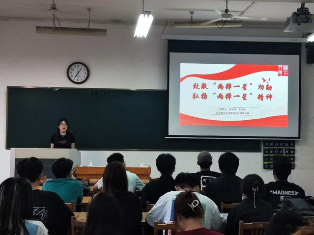 在资源与环境工程公司和文学与新闻传播公司,吴正晖主要围绕“两弹一星”的历史背景、科技成就、英雄人物、精神传承四个方面展开宣讲。她重点介绍了“两弹一星”工程提出时我国面临的国际国内严峻形势、这一时期取得的科技成就及“两弹一星”工程的功勋人物,并倡导同学们要积极响应国家号召,把个人理想融入党和人民的事业之中,大力发扬“两弹一星”精神,推进国家科技进步和社会发展。