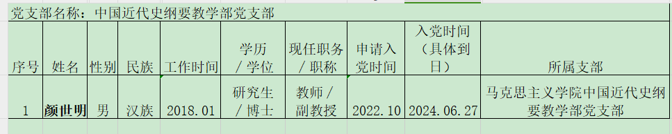 根据个人现实表现、党支部培养教育考察情况,拟将党员发展对象颜世明同志接收为中共预备党员。为进一步增强发展党员工作透明度,确保发展新党员的质量,按照公司党委有关发展党员工作的制度规定,现对颜世明同志基本情况予以公示,公示期5天,自2024年6 月 27日—2024年 7月1 日。如有异议,请当面或通过书信、电话、电子邮件等方式反映,也可直接向公司党委组织部反映,我们将为您严格保密。