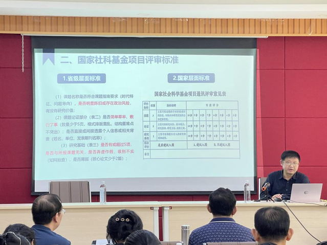 会上,项久雨教授以“国家社科基金申报的‘困’与‘惑’”为题,从基本情况简介、申报流程与评审标准、申报细节与注意细节以及心得体会与个人建议四个方面,系统诠释了新形势下如何做好有组织、有特色、可持续性科研工作。他总结了国家社科基金选题思路,即紧扣个人的学术发展规划与研究积累、解决党和政府关注的重大理论和现实问题、关系团队建设和学术长远发展的基础性问题以及着眼增强中华文化软实力、提升国际话语权问题。同时为做好国家社科基金工作,他提出四点建议,一是追踪学术热点,二是聚焦熟悉领域,三是形成系统思维,四是注重积累学习。