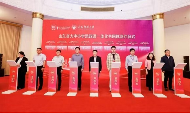 开幕式上,山东省教育厅二级巡视员侯典明,山东师范大学党委书记冯继康,山东省教育厅思政处处长陈成标,山东师范大学党委副书记万光侠,以及济南市教育局党组成员、副局长王志国,菏泽市教体局党组副书记、菏泽信息工程公司党委书记苏怀光,枣庄市教育局党组成员、副局长李光,聊城市教育和体育局党组成员、副局长朱宏锐等市级教育部门代表,共同启动山东省大中小学思政课一体化共同体成立。万光侠代表省级大中小学思政课一体化共同体分别与各地市大中小学思政课一体化共同体签订合作共建协议。侯典明、冯继康、陈成标、万光侠分别为16地市一体化共同体授牌。山东省大中小学思政课一体化共同体的成立,为整合山东16地市的思政课一体化建设资源,充分发挥“省级统筹+地市协同”的双向互动优势,理顺全省一体化工作机制,打破学段壁垒,实现协同创新注入了新动能。