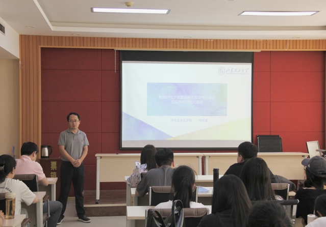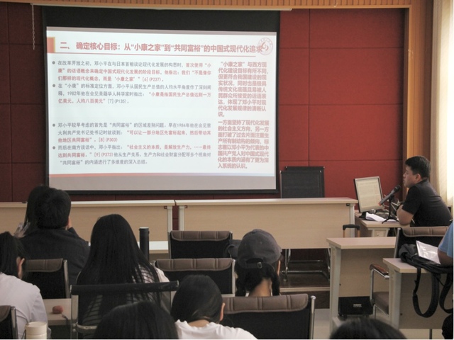 研究生李忠涛作了题为“邓小平对中国式现代化的创新探索和经验启示”的报告。他从课题研究背景与意义、国内外研究现状及研究评析、研究思路、主要研究内容四个方面论述,带我们回溯了改革开放初期邓小平同志从“小康之家”到“共同富裕”的理论创新。