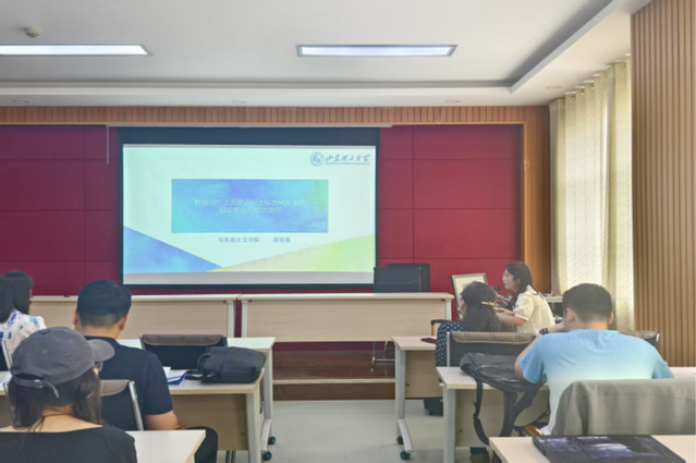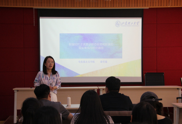 研究生姜雪莲作了题为“智媒时代主流意识形态视觉化叙事的现实审视与优化路径”的报告。她从智媒时代主流意识形态视觉化叙事的现实表征、风险挑战、优化路径三个方面进行详细阐述,通过媒介思维为意识形态阵地建设提供了新思路。