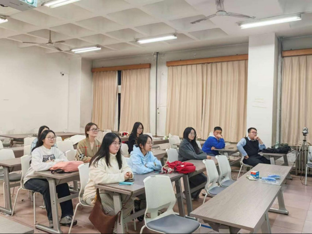 谭洪波以《习近平谈治国理政》第五卷(专题三、四)和《纵深推进全国统一大市场建设》(《求是》2025年18期)为核心进行导学。他结合数字经济、数据要素等研究领域,深入解读了其中蕴含的经济治理智慧与全国统一大市场建设的战略意义,为同学们搭建起理论与实践的衔接桥梁。魏琪嘉则以“坚定唱响中国经济光明论”为题作专题报告,他从宏观经济形势分析、产业经济运行研判等角度出发,结合长期跟踪的工业、服务业经济运行及产业政策国际动态,系统阐释了中国经济的发展韧性与光明前景,有力提振了大家对中国经济的信心。