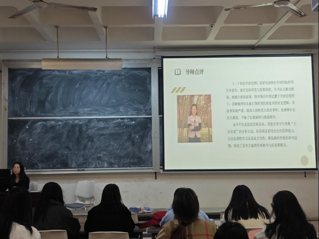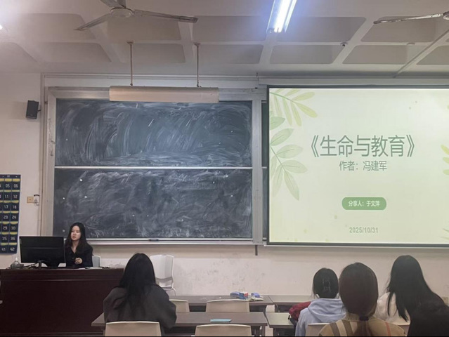 本次读书会的阅读书目是《二十世纪中国史纲》和《生命与教育》。王佳祺从作者简介、写作背景、写作框架、主要贡献及作品评价五方面对《二十世纪中国史纲》展开分享。她认为该书主要贡献在于唯物史观指导下的实证研究以及整合了革命和现代化话语。这一整合为构建中国特色的现代性叙事提供历史依据。于文萍从作者简介、主要内容、个人感悟三方面进行分享。她认为《生命与教育》回应了教育为何与“生命”疏离的困境之问,回答了什么是“生命化教育”,提出了如何走向生命化教育的实践路径。
