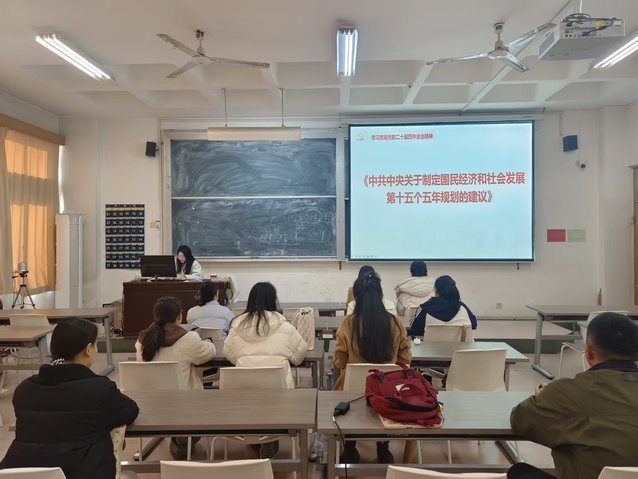 按照学习安排,本次会议由孙珺艳同志领学党的二十届四中全会精神,重点研读《中共中央关于制定国民经济和社会发展第十五个五年规划的建议》。孙珺艳同志系统介绍了党的二十届四中全会的召开背景与重大意义,并就“十五五”规划建议中“扩大高水平对外开放,开创合作共赢新局面”“优化区域经济布局,促进区域协调发展”等重点内容作了详细解读。她紧密结合国家战略方向与研究生学习科研实际,引导同志们将全会精神与规划要求融入专业学习和学术研究中,激发大家的深入思考和热烈交流。