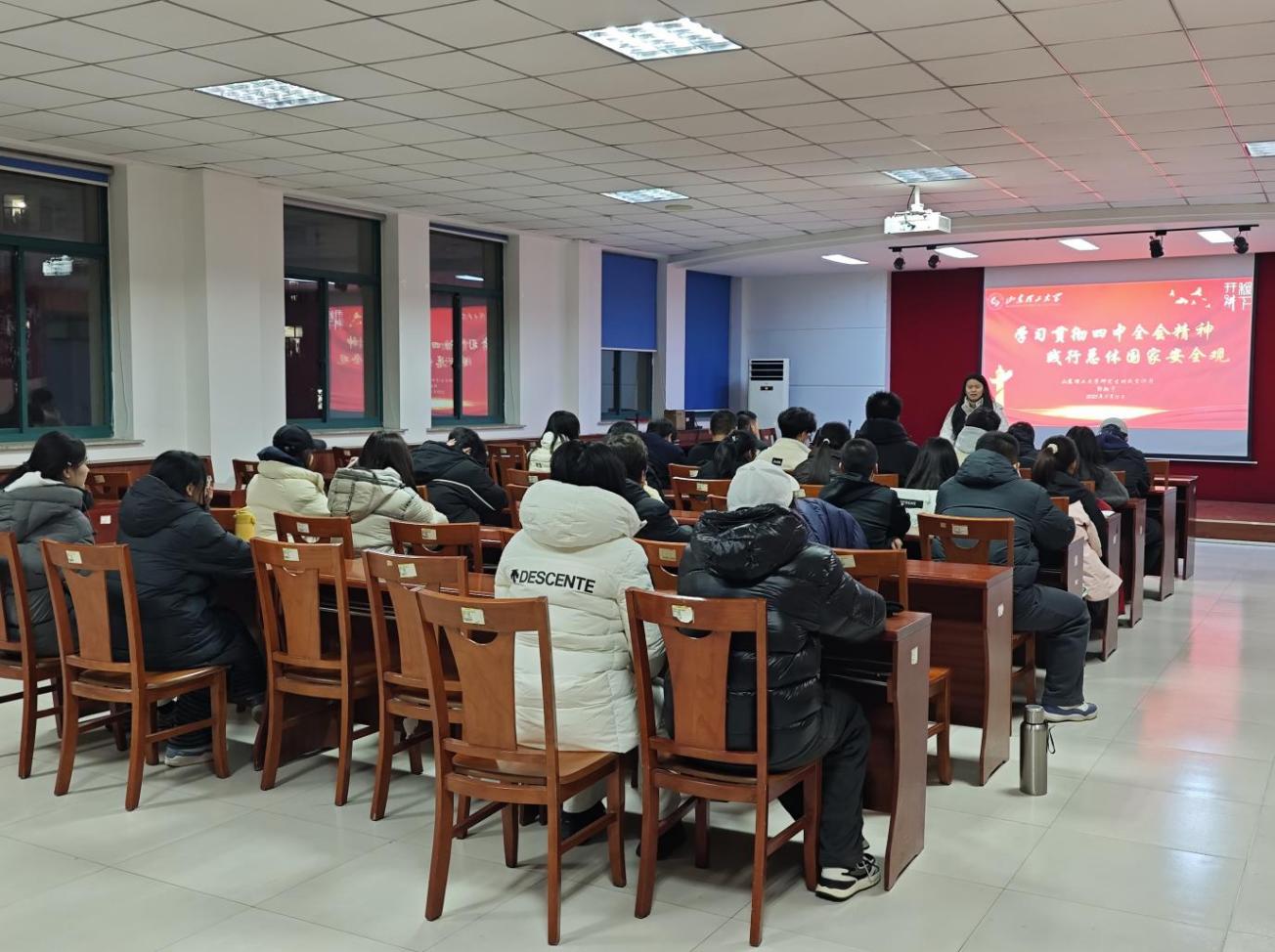 12月23日,郭翔宇在老员工艺术中心222会议室面向校团委员工骨干开展党的二十届四中全会精神宣讲活动。她围绕全会公报中“推进国家安全体系和能力现代化,建设更高水平平安中国”这一内容进行展开深入剖析,阐释了“坚持统筹发展和安全”的战略定位,以及健全法治体系、强化科技支撑、提升基层治理效能等具体路径。