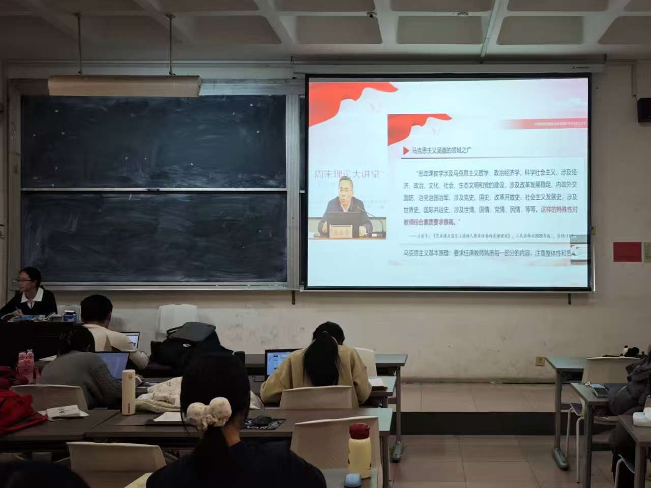 兰桂萍围绕《大力弘扬伟大爱国主义精神,把强国建设、民族复兴伟业不断推向前进》以及“思政课教师要心有大爱”两方面内容展开讲解,深入剖析了爱国主义的当代价值与实践要求,强调思政课教师需以家国大爱、教育挚爱与学子关爱,让思政课入脑入心。王永贵则以“善用‘看家本领’讲好思政课的道理”为主题,指出要立足马克思主义立场观点方法,结合青年特点创新教学形式,将时代主题融入课堂,引导青年在明理中坚定信念、担当使命。